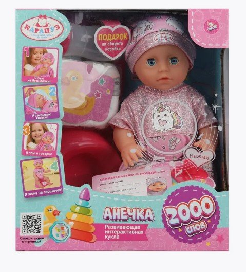Пупс «Анечка» станет идеальным подарком для маленькой принцессы! Этот озвученный пупс умеет говорить 2000 слов, петь 5 знаменитых песен из мультфильмов и рассказывать стихи, что делает его настоящим другом для ребенка.