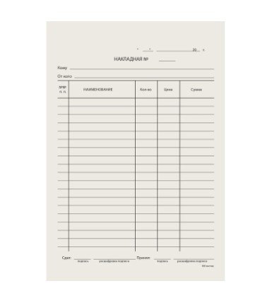 Накладная формата А5 вертикально ориентирована и имеет размеры 134 х 192мм. Служит для ведения бухгалтерского учета, используется при фиксировании факта передачи прав собственности на товары. Выполнена на газетной бумаге плотностью 55 г/м2, что обеспечивает ей низкую стоимость и широкую доступность. Благодаря склейке из 100 штук покупка оказывается еще более удачной.