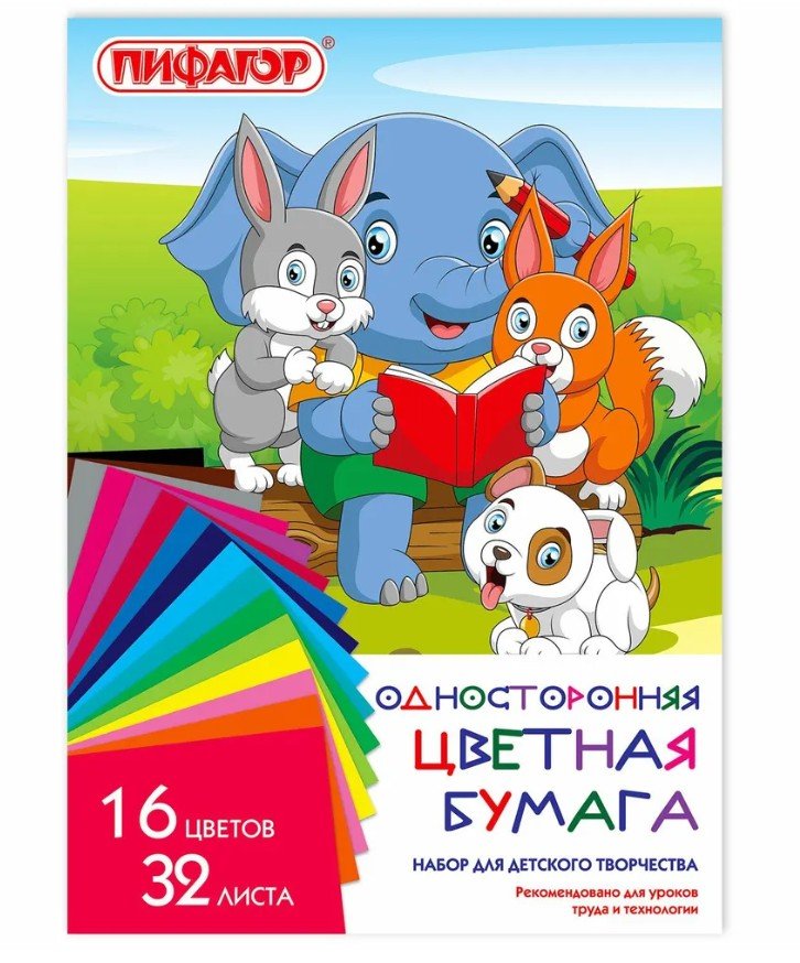 - Цветная бумага А4 газетная, 32 л. 16 цв., на скобе, ПИФАГОР, 200х280мм, Друзья, 115486