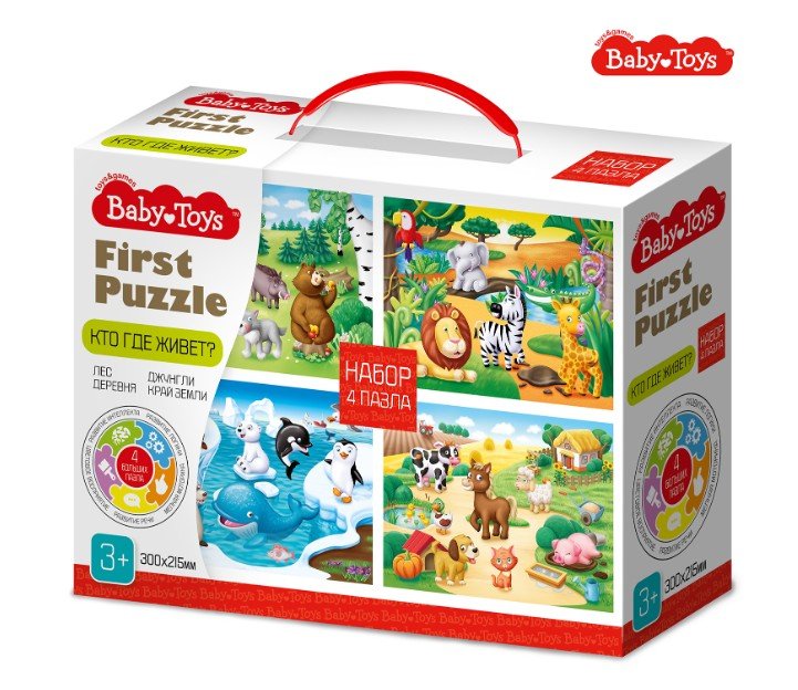 Пазлы для малышей «Кто где живет?» First Puzzle - это целый набор, состоящий из 4 пазлов для самых маленьких. Пазлы изготовлены из высококачественного многослойного картона, толщиной более 2 мм, благодаря чему элементы не теряют форму и остаются ровными. Лицевая сторона элементов защищена слоем специального экологически чистого покрытия, который препятствует быстрому истиранию и выцветанию цветных картинок. На ярких картинках изображены животные в разных средах обитания - в лесу, в деревне, в джунглях, и на краю земли.