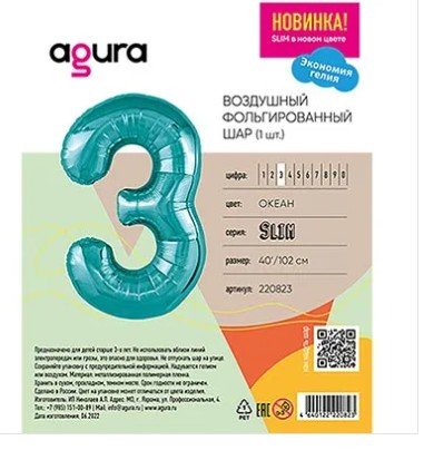 Шар фольгированный "Цифра 3" 40/100см Бирюзовый 1207-5034